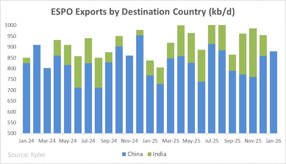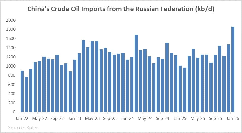 The numbers are clear: for Russia, hope now speaks Chinese. January 2026 marked the strongest month on record for Sino-Russian oil trade, with seaborne exports reaching 1.86 million b/d, building on an already record-high January 2025. More than 50% of volumes were loaded at Kozmino, near Vladivostok, and at Sakhalin. For the first time since November 2024, 100% of Russia’s ESPO exports were directed to China. Even excluding pipeline supplies of around 820,000 b/d, Russia’s seaborne shipments alone were 46% higher than Saudi Arabia’s exports, with Riyadh shipping just 1.2 million b/d in January despite its long-standing position as Beijing’s leading seaborne supplier.
